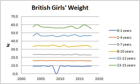 British child statures and weights (2 to 15 years) are from the Department of Health 'Health Survey for England' 2003-18. They have not changed significantly in recent years, for example: